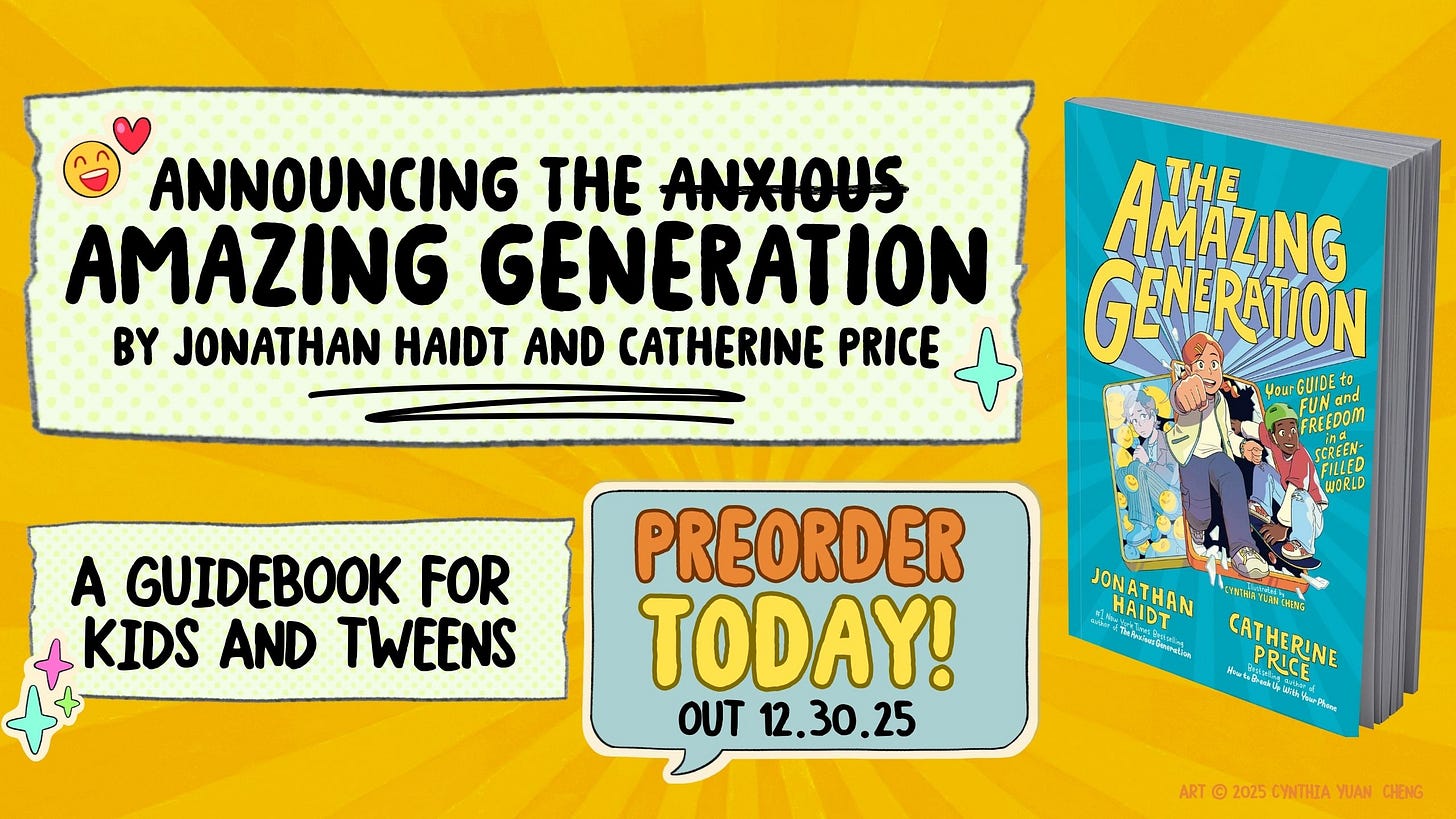 The Amazing Generation, my new book for kids (coauthored with The Anxious Generation author Jonathan Haidt) comes out December 30th. I just received my own copy and it looks great (a huge shoutout to Cynthia Yuan Cheng for creating art that brings the book to life). I truly can’t wait for you all to check it out!